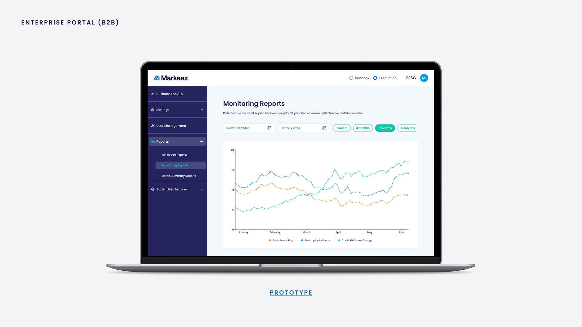 For the Markaaz Enterprise Portal, my approach centered on creating a seamless and intuitive user experience that aligns with the portal's multifaceted functionalities. Collaborating closely with cross-functional teams, I developed a user-centric design that prioritizes accessibility, ensuring that users can effortlessly navigate the portal and leverage its features. The visual design incorporates a clean and modern aesthetic, maintaining consistency with Markaaz's brand identity. To enhance user engagement, I employed a clear information architecture, allowing users to efficiently validate small businesses, manage risk, and address compliance concerns. The result is a sophisticated and user-friendly enterprise portal that empowers businesses to make informed decisions while seamlessly integrating with our Business Monitoring Service and API Suite configuration.