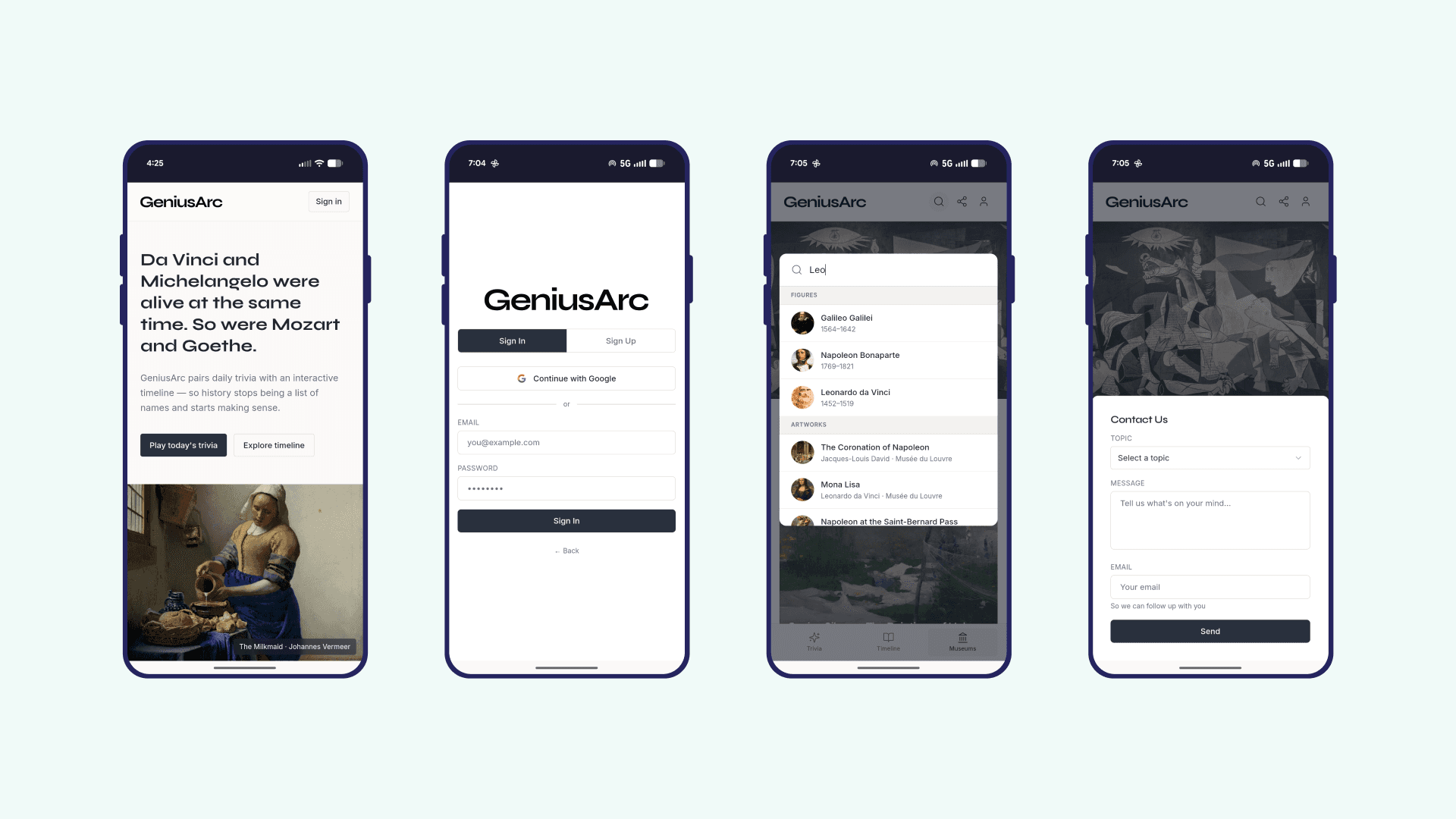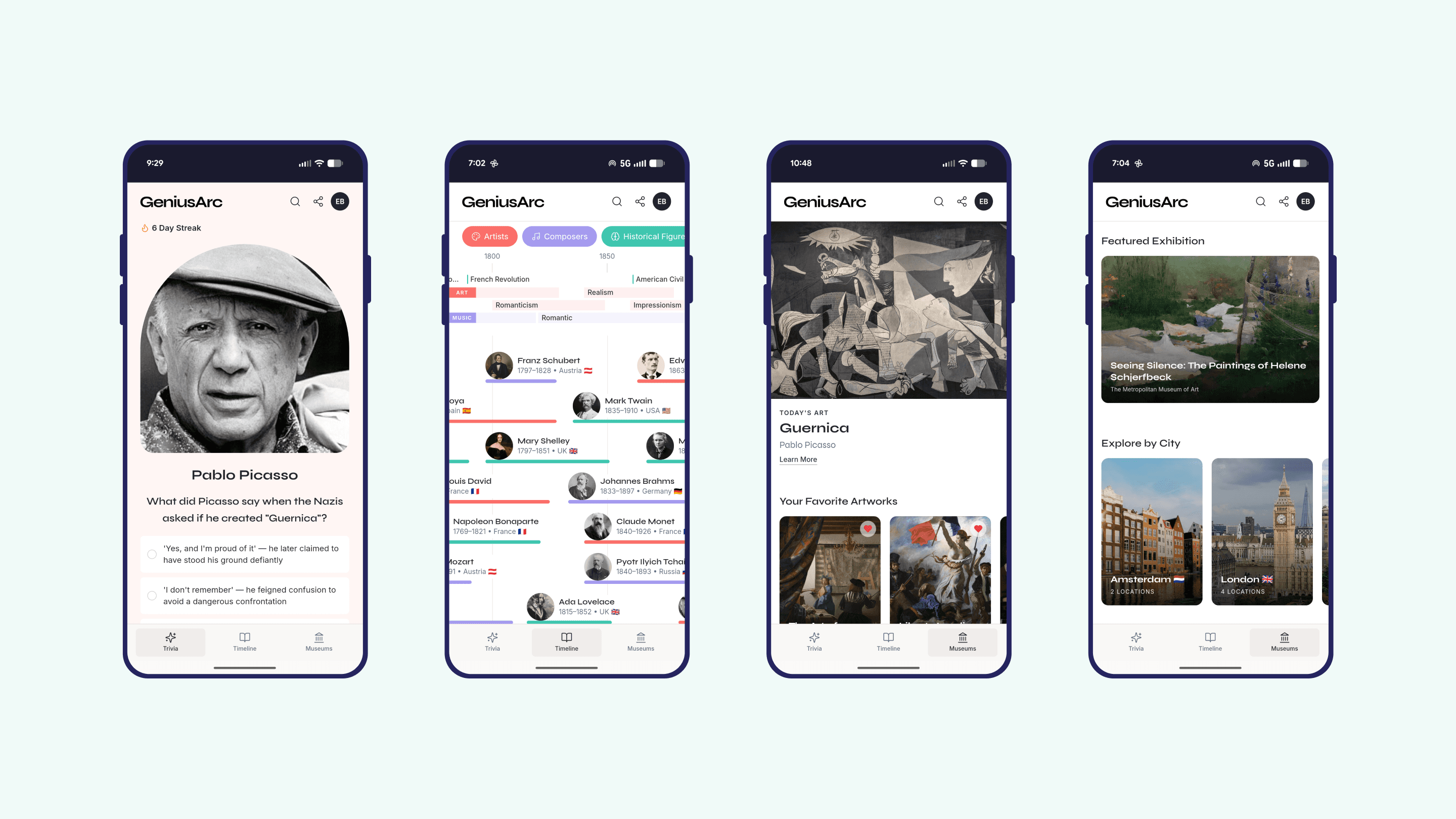 Where other apps give you isolated facts, GeniusArc gives you a world. The quiz is the hook — one question, one legend, every day. But the answer opens into a figure's full biography, their place on an interactive historical timeline, their artistic legacy, and the museums where their work lives. Each layer adds context to the last.