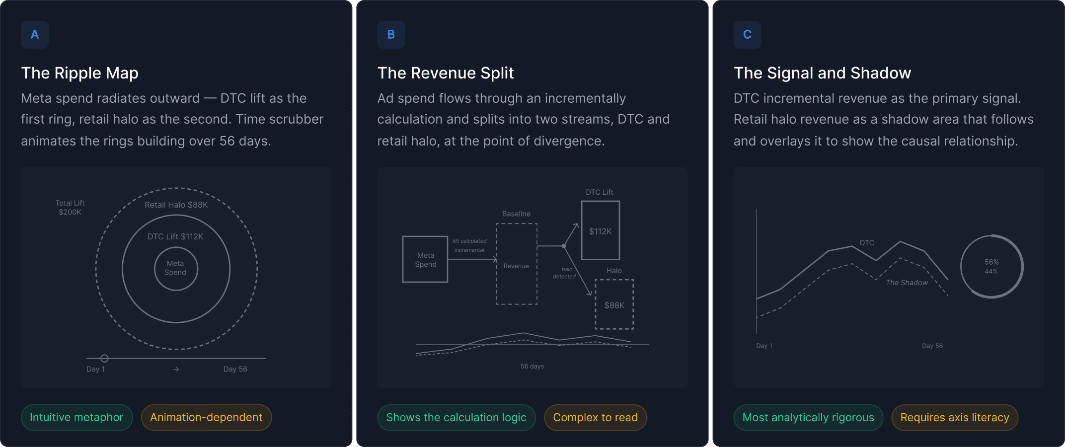 The Signal and Shadow was the most analytically rigorous — DTC incremental revenue as the primary signal, retail halo revenue as a shadow area overlapping it over 56 days. The halo literally follows the DTC signal, encoding the causal relationship temporally. This was the direction I selected for development, combined with the ripple metaphor as a hero visual.