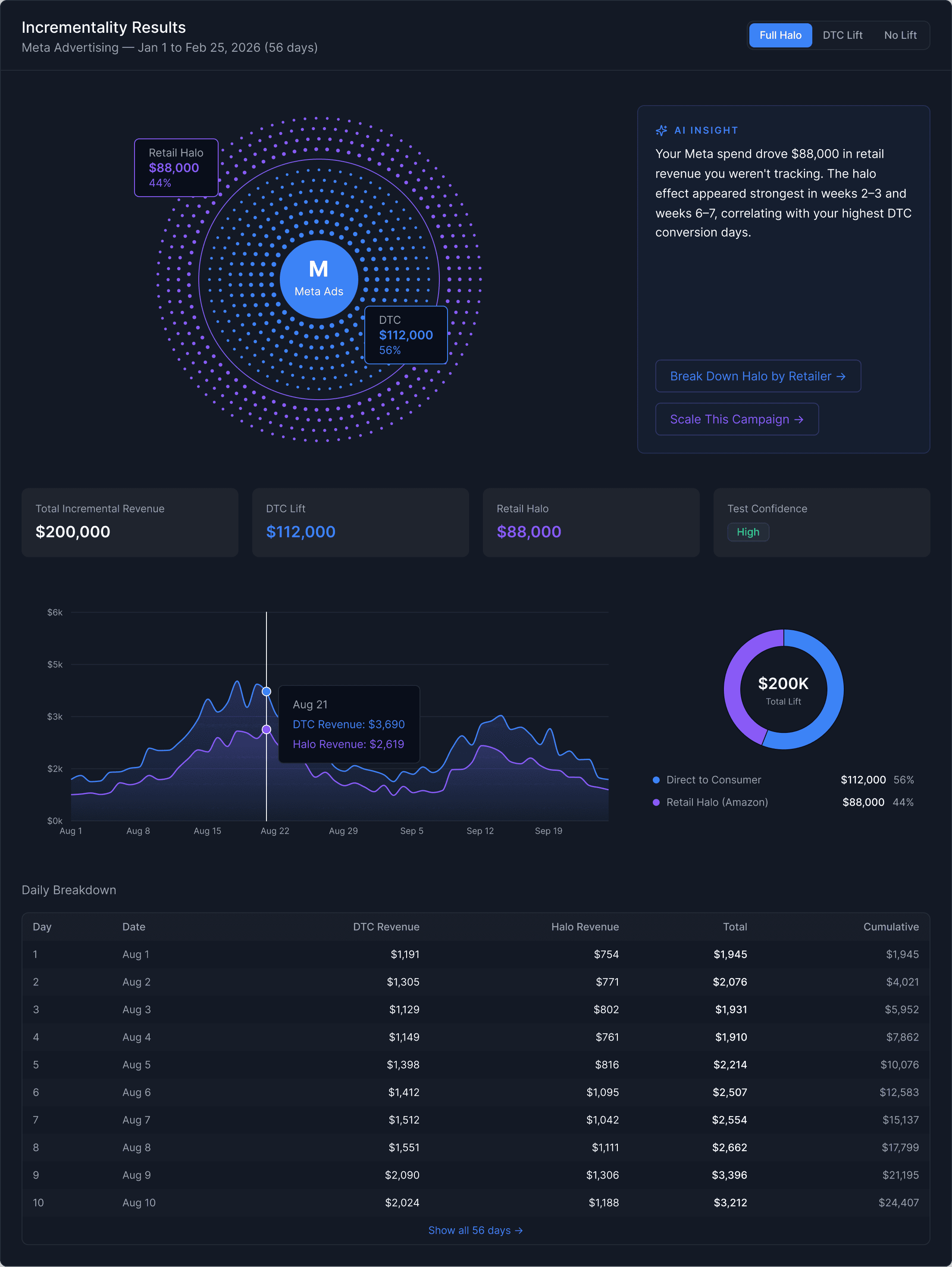 The KPI row below confirms the aggregate numbers. The overlapping area chart shows both revenue streams across the full 56 days — the violet halo area following and mirroring the DTC signal, slightly smaller and more transparent, making the causal relationship visible temporally. The daily breakdown table gives granular data for anyone who needs to verify the numbers row by row.